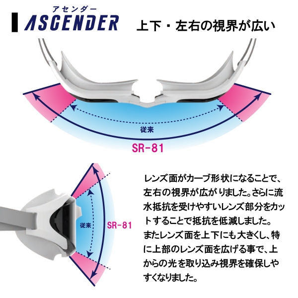 カーブ形状のレンズ面になることで、流水抵抗の低減を実現。また、ゴーグル側面までレンズが広がり、より広い視界を確保します。